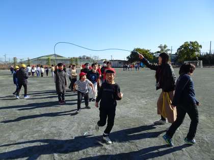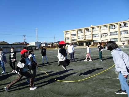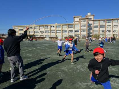 今日のふれあいタイムは、運動場で5年生と一緒に長縄跳びをしました。なわとび大会に向けて、連続で8の字跳びができるように声をかけあって跳んでいました。