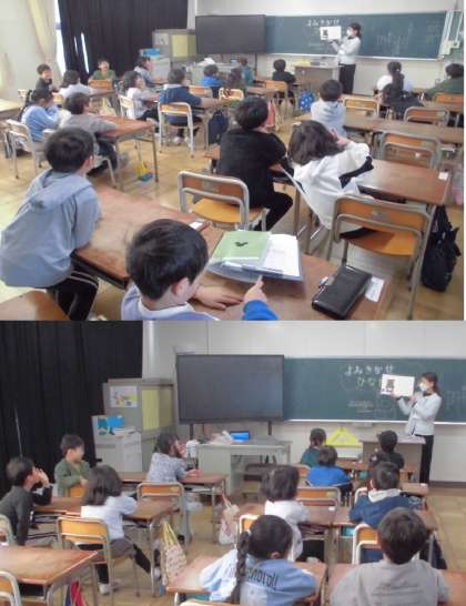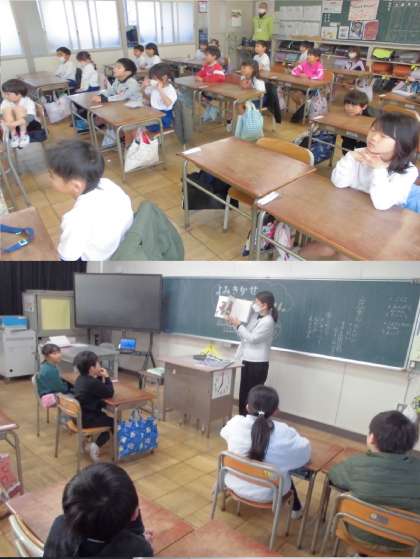 読み聞かせ【1月19日(金)1年生】 公開日 2024/01/19 更新日 2024/01/19 1年 ひなたぼっこさんに読み聞かせをしていただきました。本の絵をみて歓声があがるなど、楽しい読み聞かせをしていただきました。