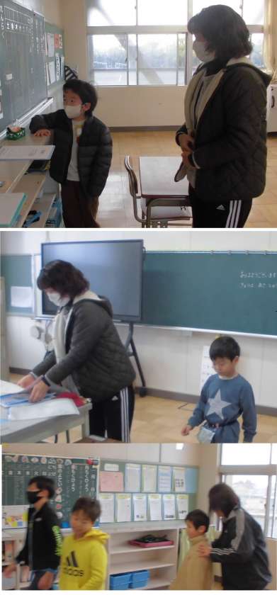 交流学級へ行き今日の予定をたて、集会へ参加する準備をしようとしています。