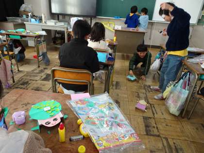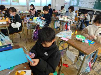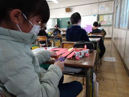 ねじったゴムがもどる力を使った作品を作っています。仕組みを理解し、動くと楽しいものになるように真剣に取り組んでいます。