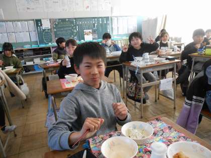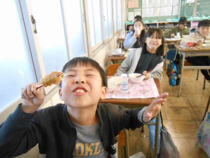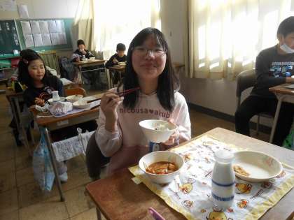 今日の献立は「豚汁」、「わかめご飯」、「あじのフリッター」です。