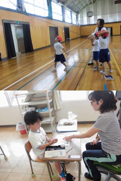 2年生は、体育。投げ方の練習です。
