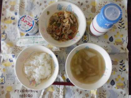 今日の献立は、ごはん、牛乳、ぶた肉と野菜の細切りいため、はっぽうたん、ヨーグルトです。