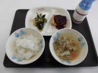 今日の献立は、わかめごはん、牛乳、さんまの銀紙焼き、五目きんぴら、のっぺい汁です。