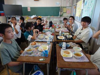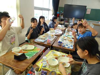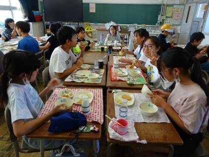 給食の時間、グループで会話の楽しみながら食べていました。「おいしいね。」「今日のスープは…。」など、献立に関する会話もよく聞こえてきます。毎日、笑顔で、楽しい時間になっています。