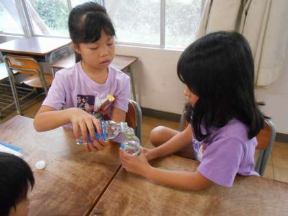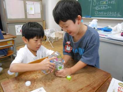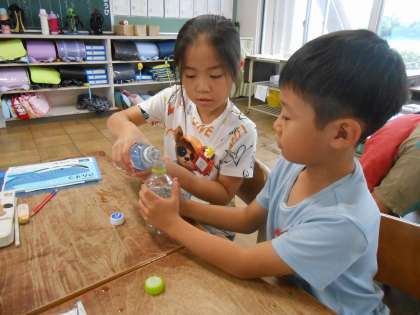 水がたくさん入るのはどちらの入れものかな。 実際に水をうつしかえて調べてみよう。