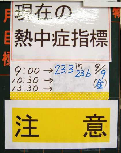 朝晩は涼しい日が多くなりましたが、まだ熱中症に対する備えを怠るわけにはいきません。毎日3回、WBGTという計測機器を使って「熱中症指標」を調べ、指導に役立てています。指標が28を超えたら要注意です。激しい運動や持久走は避けなければなりません。【1枚目の写真参照】