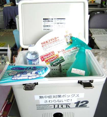 また、万が一に備えて熱中症対策ボックス【2枚目の写真参照】を保健室だけでなく職員室や屋内運動場などに用意してあります。