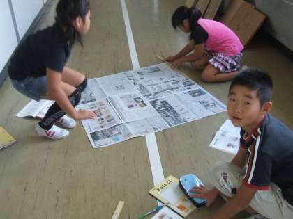 9月16日(金)の4年生 公開日 2011/09/16 更新日 2011/09/16 4年 算数の授業で、新聞紙を使って1平方メートルの大きさを作りました。 「そこ、テープで止めて。」 「押さえておくから長さ測って。」 「行き過ぎ、もう少し重ねて。」 などと協力しながら、1平方メートルの大きさを作っていました。 作ってみると、意外と大きいということに気がつきました。