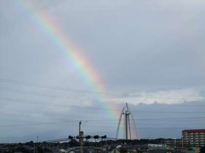 朝7時、窓を開けようと教室に向かうと、廊下の窓から大きな虹が見えました。