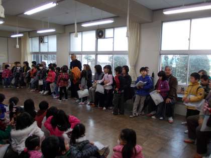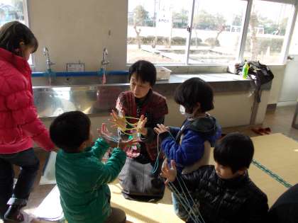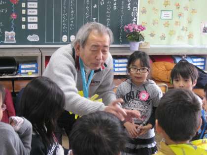 今日は、おじいちゃん、おばあちゃんに来ていただいて、『昔あそび』をしました。めんこ・だるまおとし・けん玉・あやとり・お手玉・こままわし・・・いろいろ遊びました。上手にできないときには、遊び方のこつを教えていただいて、またまた挑戦!「今度、入学してくる1年生に教えてあげるんだ」とはりきっていました。