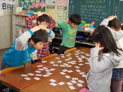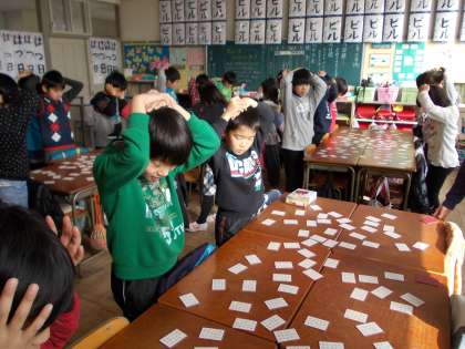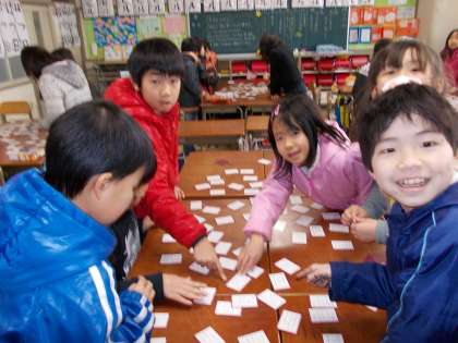 ふれあいタイム (2月8日 3年生) 公開日 2012/02/08 更新日 2012/02/08 3年 国語の「かるた」の学習に出てきた百人一首を使って、ふれあいタイムを行いました。聞き慣れない短歌に、はじめはなかなか取り札が見つかりませんでしたが、二回戦・三回戦と進むうち、上の句・下の句をしっかり聞き取って、素早くカードを取り合う姿が見られました。