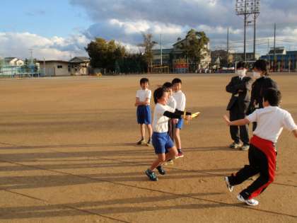 【3枚目】ロードレース部で継走(リレー)の部に出る子は、たすき渡しの練習をしました。