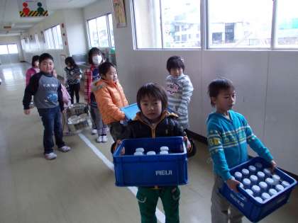 1組は給食を食べ終わり、みんなで協力して片付けをしています。