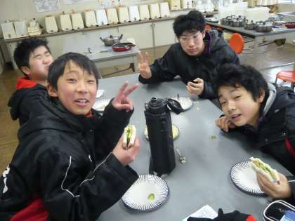 バレンタインデーということでチョコレートをおまけとしてつけました。サンドイッチのおいしさと達成感とで、みんなが笑顔の試食会でした。