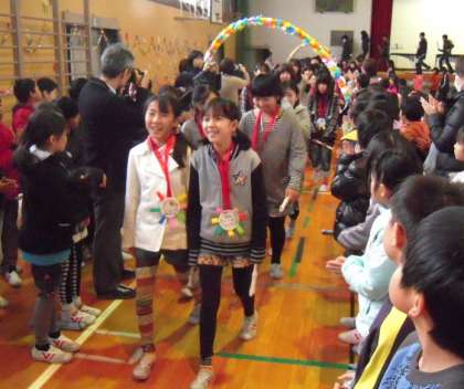 まず、首飾りをかけた6年生たちが、花のアーチをくぐり抜けながら入場しました。