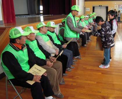 子どもたちの毎日の登下校を見守っていただいた方たちを学校へお招きして、本校屋内運動場で感謝の会を催しました。児童代表からのお礼の言葉や児童一人一人が書いた感謝の手紙をお贈りしました。