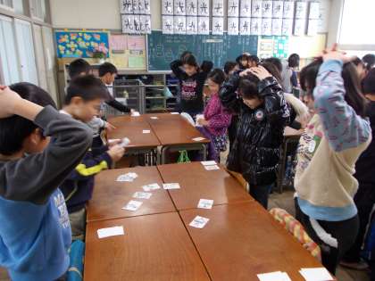 みんなで遊んだよ (3月14日 3年生) 公開日 2012/03/14 更新日 2012/03/14 3年 屋内運動場で、みんなで遊びました。写真は、玉入れの玉を使った「玉落とし」です。みんな玉を持って真剣に走りました。社会の時間には、一宮市の古い建物や祭・伝統芸能などを読み札とした郷土かるたを作り、かるた遊びをしました。3年生もあと少しです。多くの友達とふれ合ってほしいと思います。