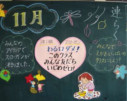 教室の背面黒板には、担任の先生から子どもたちへのメッセージが書かれています。季節の言葉や教師の所感が多いのですが、写真のようなメッセージならいじめをなくすためのヒントになっていくのではないでしょうか。