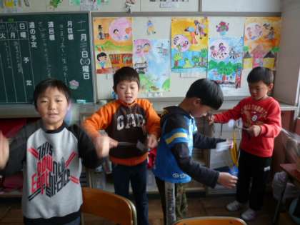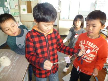 びゅんびゅんごまで遊んだよ 11月27日(火)の2年生 公開日 2012/11/27 更新日 2012/11/27 2年 国語で「おもちゃの作り方を説明しよう」という勉強をしています。そこで、びゅんびゅんごまを作りました。作ったのはいいのですが、なかなかうまく回せずにみんな悪戦苦闘。その分、回ったときは満面の笑みでした。