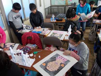 刷った自画像を台紙に貼る作業を行いました。版画はこれでついに完成です。