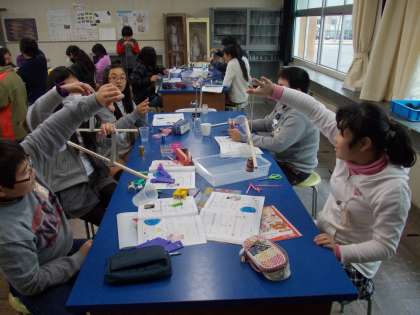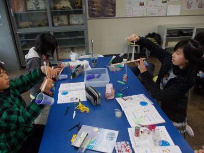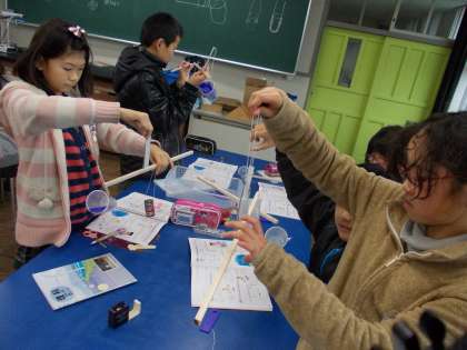 てこの応用です 1月21日(月)の6年生 公開日 2013/01/21 更新日 2013/01/21 6年 理科の授業風景です。 てこの勉強をし、自分の竿秤(さおばかり)を作りました。 中心から遠くに行くと重くなる ということを実感しながら作っていました。