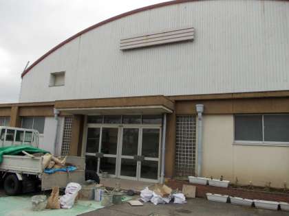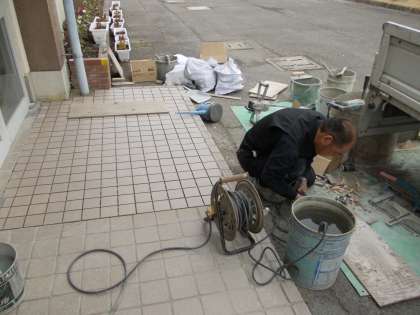 工事の様子【1月22日(水)】 公開日 2013/01/23 更新日 2013/01/23 校長室より 体育館の東玄関の工事をしていただきました。上り口のタイルが浮き上がり、危険な状態になっていたのです。展覧会に間に合うように頑張ってもらいました。では、プロの技を一部お見せします。まず微妙な幅の「角」はどうでしょう。