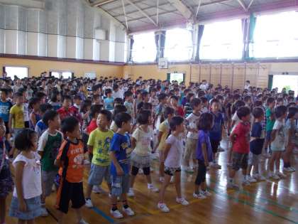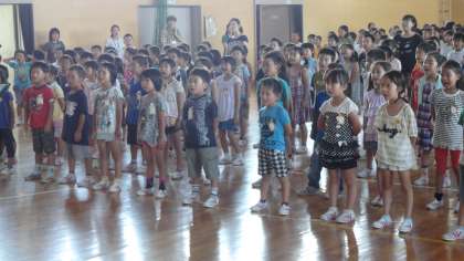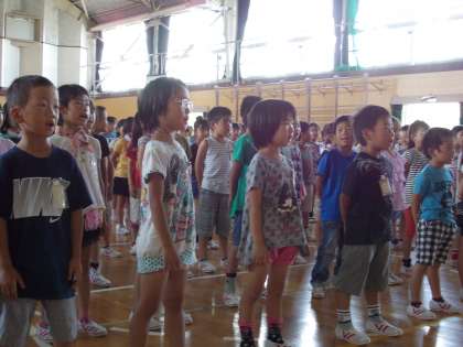 全校で浅井中小学校の校歌を歌いました。449人の声が屋内運動場に響きました。なかなか揃えることは難しいことです。ましてや、この猛暑です。じっとしていても汗が流れ落ちてきます。音楽の担当の先生の言葉を真剣に聞き、どんどん声が遠くまで広がっていく感じがしました。子どもたちの何かをしよう、何かを吸収しよういう気持ちがこちらまで伝わってきました。2年生の子たちも、口を大きく開けて、息をいっぱい吸って♪♪♪