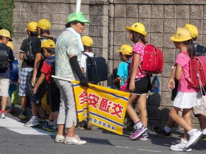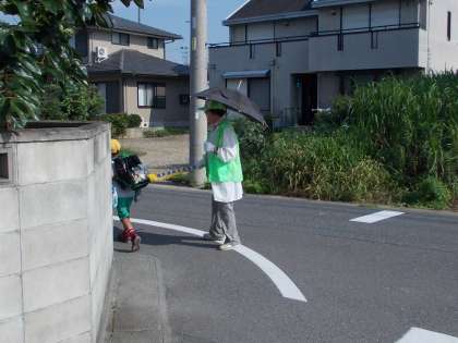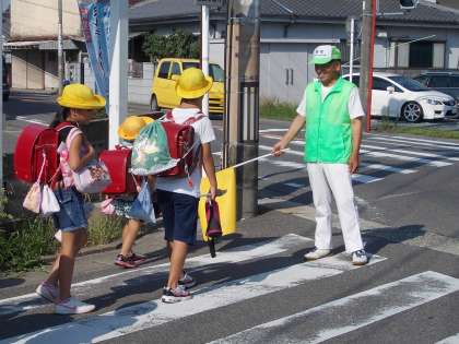 子どもたちに優しく声をかけて注意を促す見守り隊の皆さんです。毎日粘り強く取り組んでいただいています。