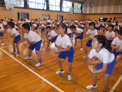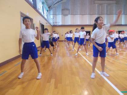 5時間目にソーラン節の練習をしました。3年生と4年生合同で、まず最初の動きを確認しました。
