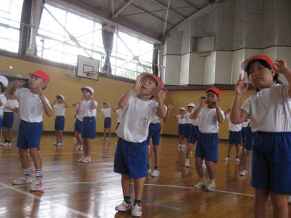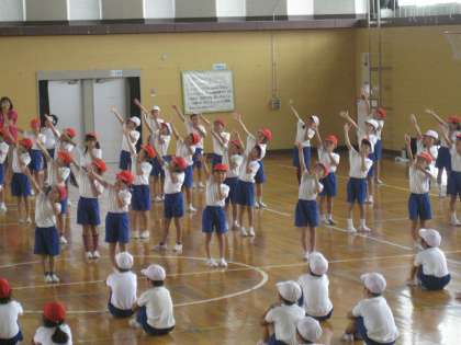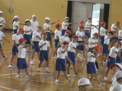 運動会の練習も2日目です。今日はちょっぴり涼しい感じがしましたが、室内は蒸し暑いので熱中症にならないように気をつけてやっていました。ダンスは、なんと全部通して行うことができました。1年生、2年生がそれぞれ見合う時間もありました。「リズムに合わせて、楽しく踊っていました。」「歌もうたいながら、元気にできました。」「とっても かわいかったです。」と先生たちからも褒めてもらいました。子どもたちは、明日も練習があると聞いて、熱く燃えていました。頑張れ!元気に楽しく・・・なめこに変身!