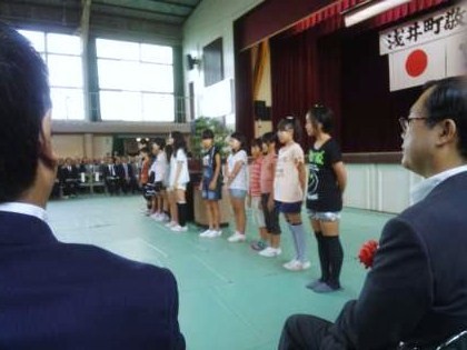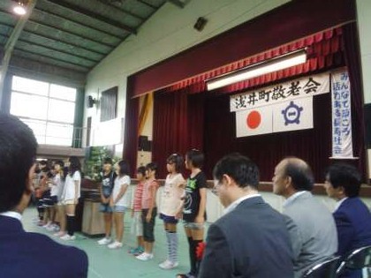 敬老の日を前に、浅井中学校では「浅井町敬老会」が行われました。今年は浅井中小学校の子どもたちが中心となって会場の受け付けをしてくれました。皆さんの前で紹介され、元気に「おめでとうございます。」とあいさつできました。