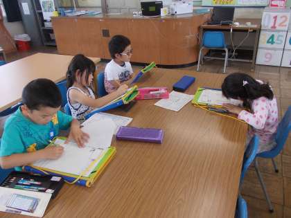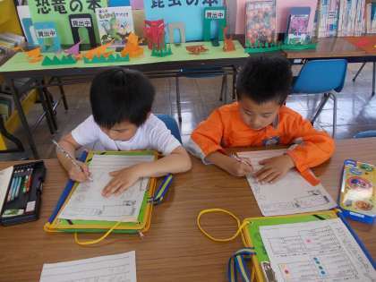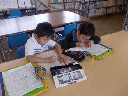 学校探検 その2 【5月23日(金)の1年生】 公開日 2014/05/23 更新日 2014/05/23 1年 今日は、3階を探検しました。ほぼ毎日のように図書室に通う子もいるので子どもたちは図書室が大好きです。ちょうど司書さんもみえて、「集中してかいているね。」と声をかけてもらいました。