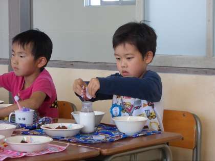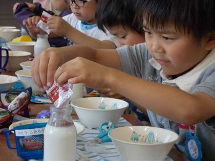 その2 公開日 2014/05/28 更新日 2014/05/28 校長室より 切った後は牛乳にこぼさないように移さねばなりません。慎重に慎重に!こぼれてもなめれば大丈夫!という子もいましたが、多くは上手に移すことができていました。