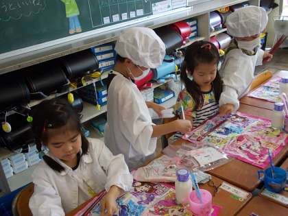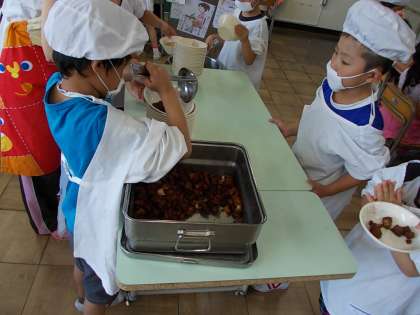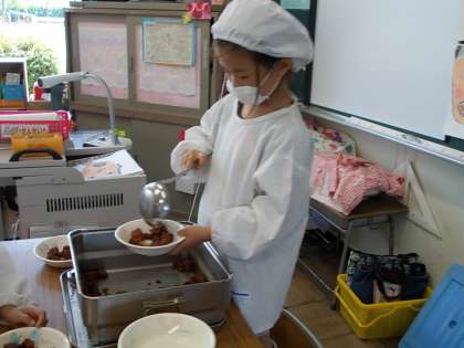 その2 公開日 2014/05/28 更新日 2014/05/28 校長室より 汁ものでしたが、よくかき混ぜながら配れます。小さいおかずも分量を考えながら?配ることができていたようです。ミルメークやストローも分担された係が責任を持って配ります。