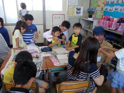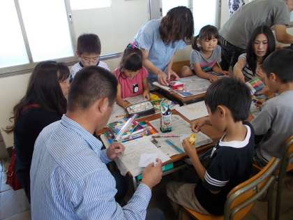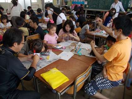 びゅんびゅんごまを作っています。どの机でも厚紙に穴をあけ、ひもを通します。これはお父さんやお母さんの仕事かな?