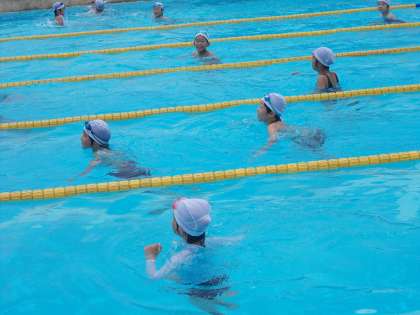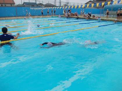 初めてのプール その2 6月17日(火)の5年生 公開日 2014/06/17 更新日 2014/06/17 5年 次は、高学年プールに移動して、25mにチャレンジ! 50m以上完泳を目標にがんばっていきましょう。
