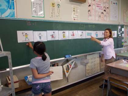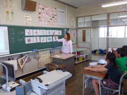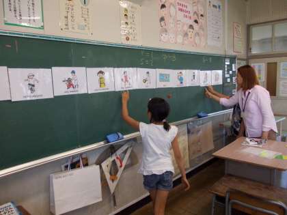 英語活動 【6月24日(火)の5年生】 公開日 2014/06/24 更新日 2014/06/24 5年 今日は、英語の授業で「I can 〜」「I can't 〜」の学習をしました。 ゲームをしたり、ジェスチャーをしたりしながら、楽しく練習することができました。