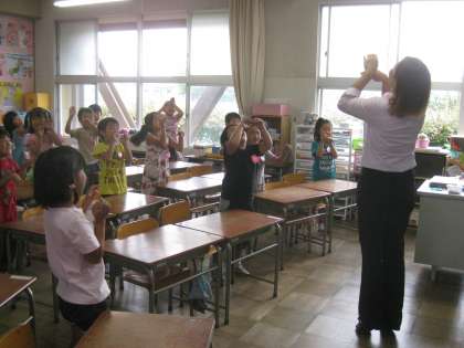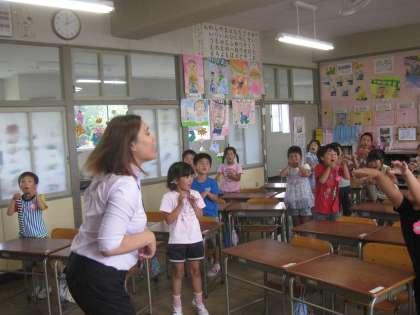 動物と鳴き声 英語活動 その1 【6月25日(水)1年生】 公開日 2014/06/25 更新日 2014/06/25 1年 子どもたちの大好きな英語活動の時間です。今日は、動物の名前と、その泣き声にチャレンジしました。初めは、戸惑っていた子もいましたが、何度も声に出して練習するうちに声もどんどん大きくなり、自信を持って活動できるようになってきたのはすごいです。3枚目の写真は、学年園に咲いた『ひまわり』です。夏本番ももうすぐですね。