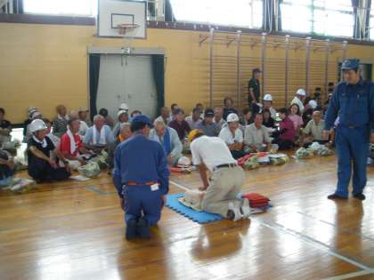 写真 中:屋内運動場では、救命救急訓練を行いました。