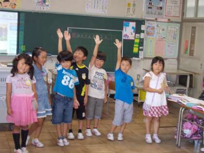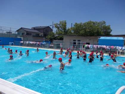 今日は、とてもよい天気で、プール日和でした。1年生の子どもたちは、プールが大好きで、水遊びを思い切り楽しんでいます。