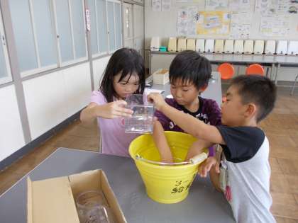 今日は、いろいろな入れ物に入る水のかさを予想しました。