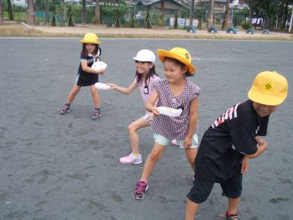 新聞紙を使って、フリスビーを作りました。