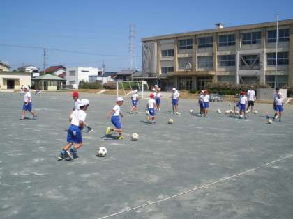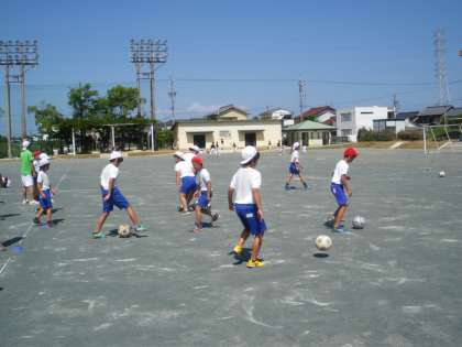 サッカー部の練習の様子です。夏休みに入ってはじめての練習のため、この暑さに少しバテ気味です。でも、大きな声を出しながらボールを追っていました。先生も汗だくになってボールを追いかけていました。