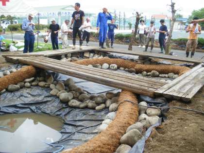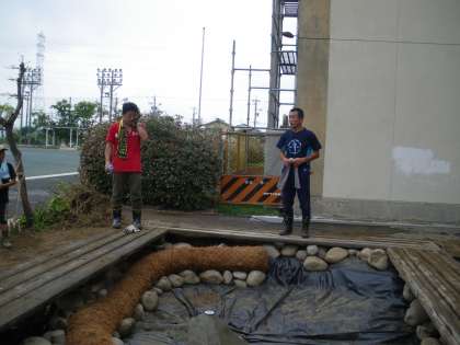 ビューティフルサンデー〜その5 【8月3日(日)】 公開日 2014/08/03 更新日 2014/08/03 PTA・学校運営協議会 みなさんのおかげで1時間余りで完成しました。ありがとうございました。コンクリートが乾いた後、水をいれ、周りに植物などを植えていきます。水辺の生物を観察できるひょうた池になっていくといいですね。
