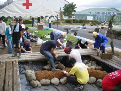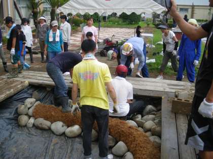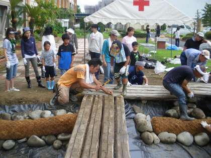 池の周りに木の板を置き、池を回れるようにします。高さが合わなかったり、長さが合わなかったりして苦労しましたが、石の配置などを工夫して見事にひょうたん池を囲むようにすることができました。