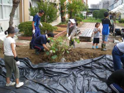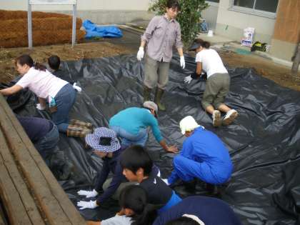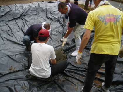 整地した池に防水シートを敷きました。シートを敷くのに邪魔になった木を抜いたり、排水の周りをコンクリートで固めたりしながら水がしっかりたまるようにしていきました。水を一度入れて、シートの様子を確認しながら作業をしていきました。