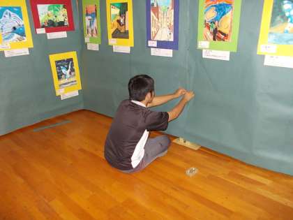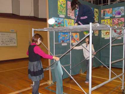 その3 公開日 2014/11/06 更新日 2014/11/06 校長室より こちらでも黙々と作業をしている先生、台車を押しながらみんなで飾り付けをする学年、さらに考え込む学年と、遅くまで作業が続けられていました。先生方の思いのこもったすばらしい会場ができるはずです。