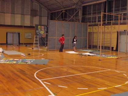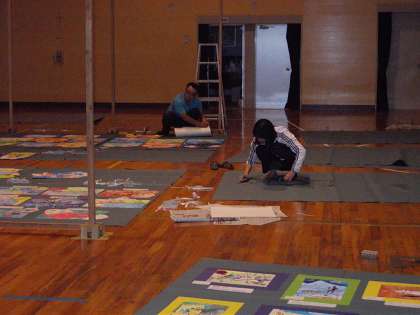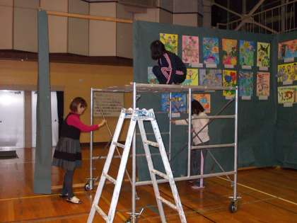 先生たちの頑張り【11月6日(水)】 公開日 2014/11/06 更新日 2014/11/06 校長室より 5時を過ぎるとあっという間に暗くなる今日この頃ですが、体育館は明るく照らし出されていました。先生方が15日に行われる展覧会の準備をしていたのです。