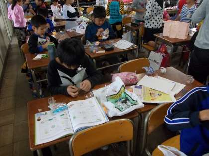 おもちゃ作り 11月12日(水) 3年生 公開日 2014/11/12 更新日 2014/11/12 3年 理科の「風とゴムのはたらき」のまとめとして、風やゴムで動くおもちゃ作りをしました。ペットボトルを使った「ピンポン玉ロケット」や、ゴムがまき戻る力を利用した「もどる車」など、それぞれがくふうをしながら、楽しく作ることができました。